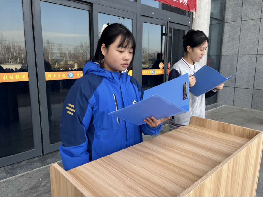 今天的升国旗仪式由我校2023级职教高考1班王艺晓同学主持,2023级职教高考1班王凯迪同学发表《安全记心间,快乐过冬天》的国旗下讲话。