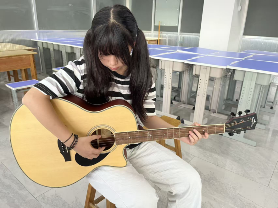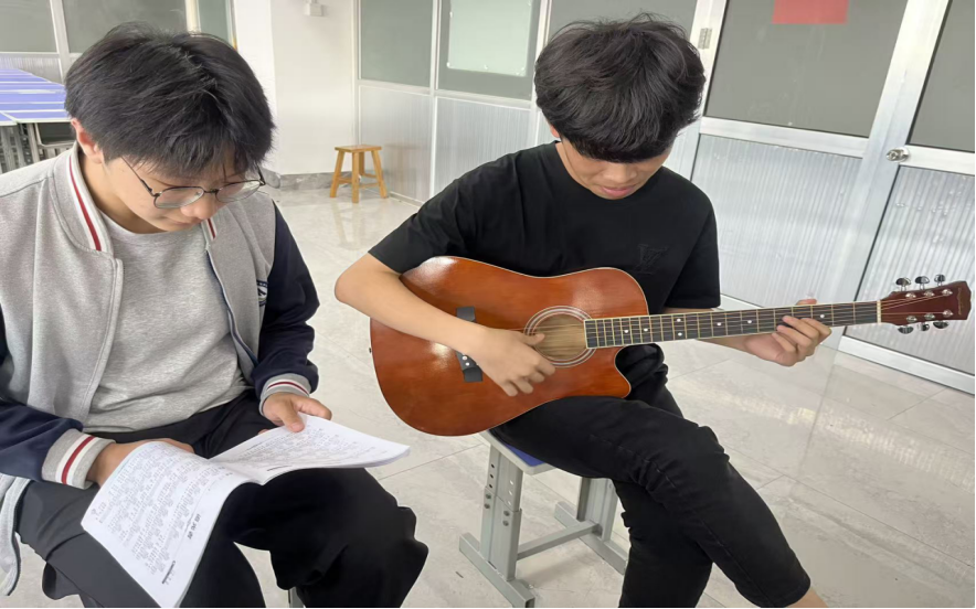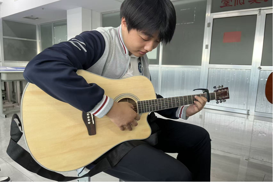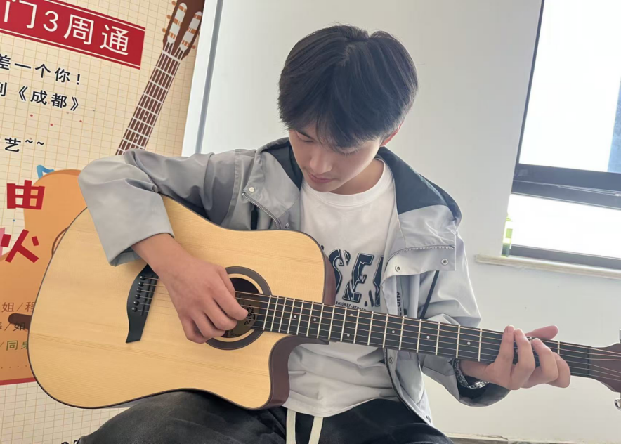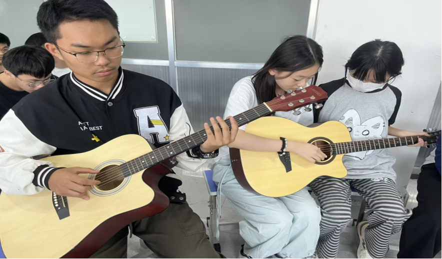 第一次活动课上,教室里坐满了各年级的同学,有已经能熟练弹唱的“高手”,也有刚刚接触吉他的“小白”。指导老师边说边演示,“无论你有没有基础,只要对吉他感兴趣,都能在这里找到属于自己的音乐天地。”