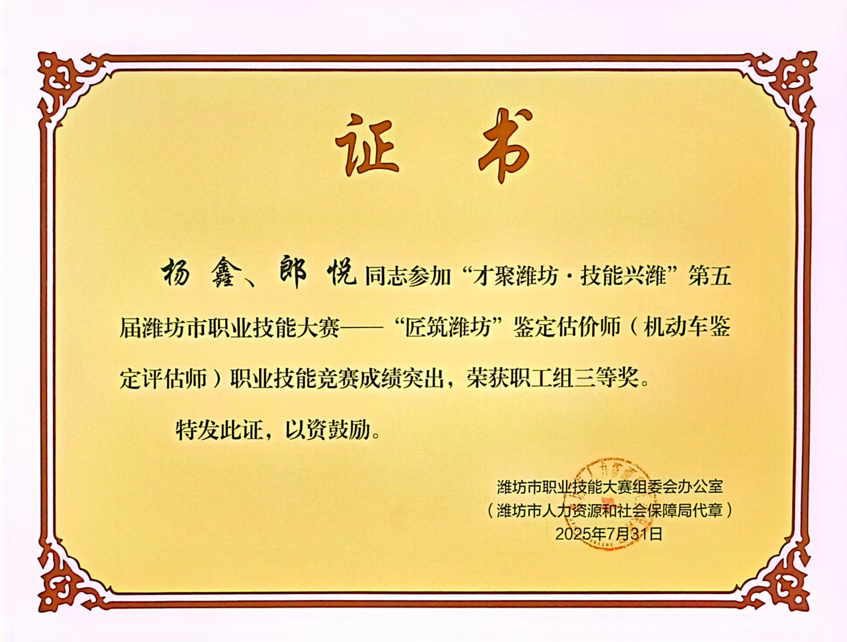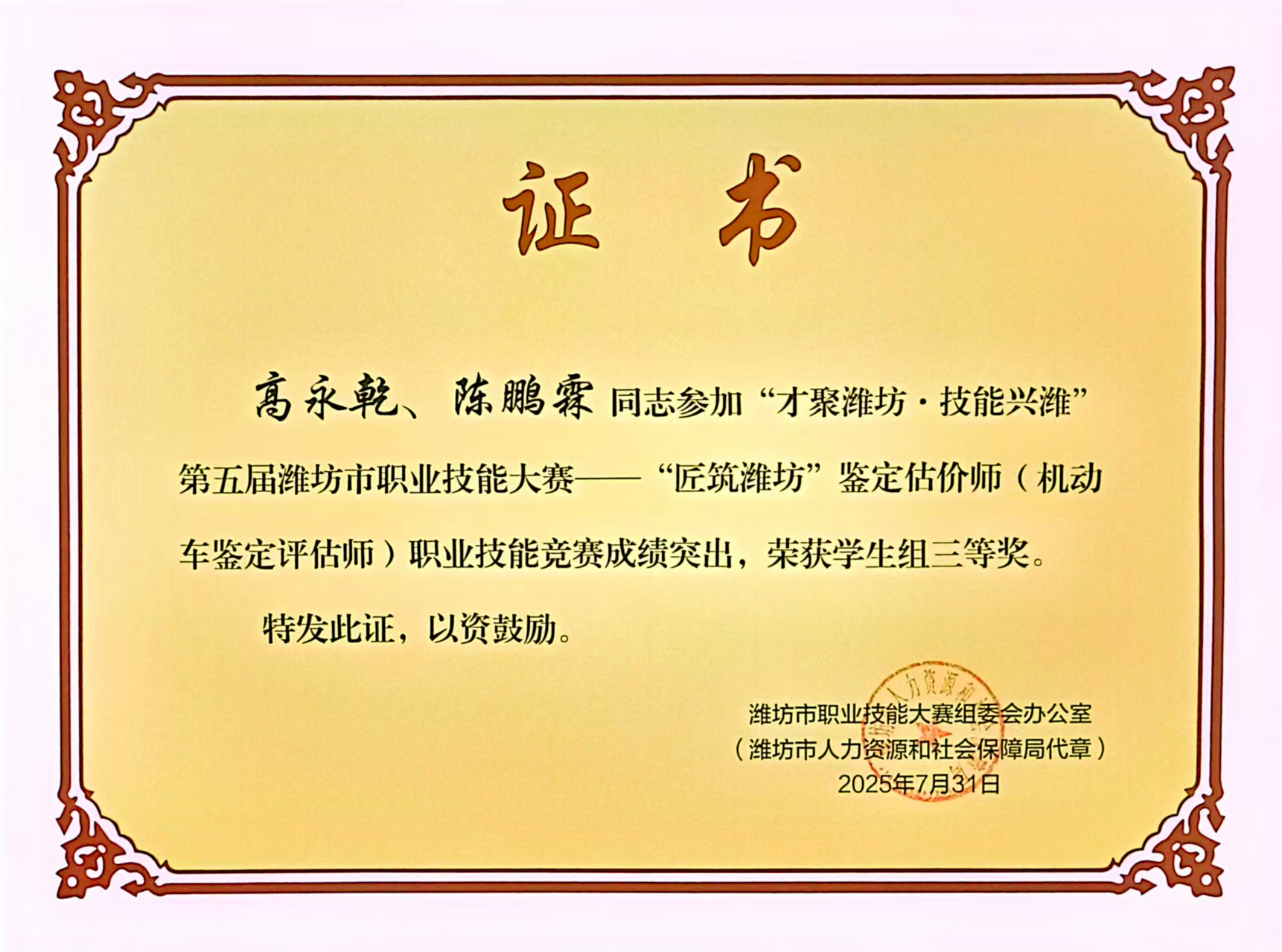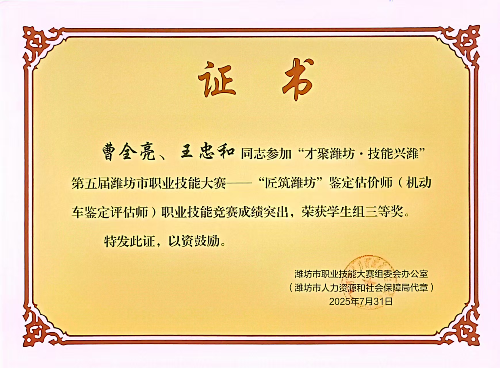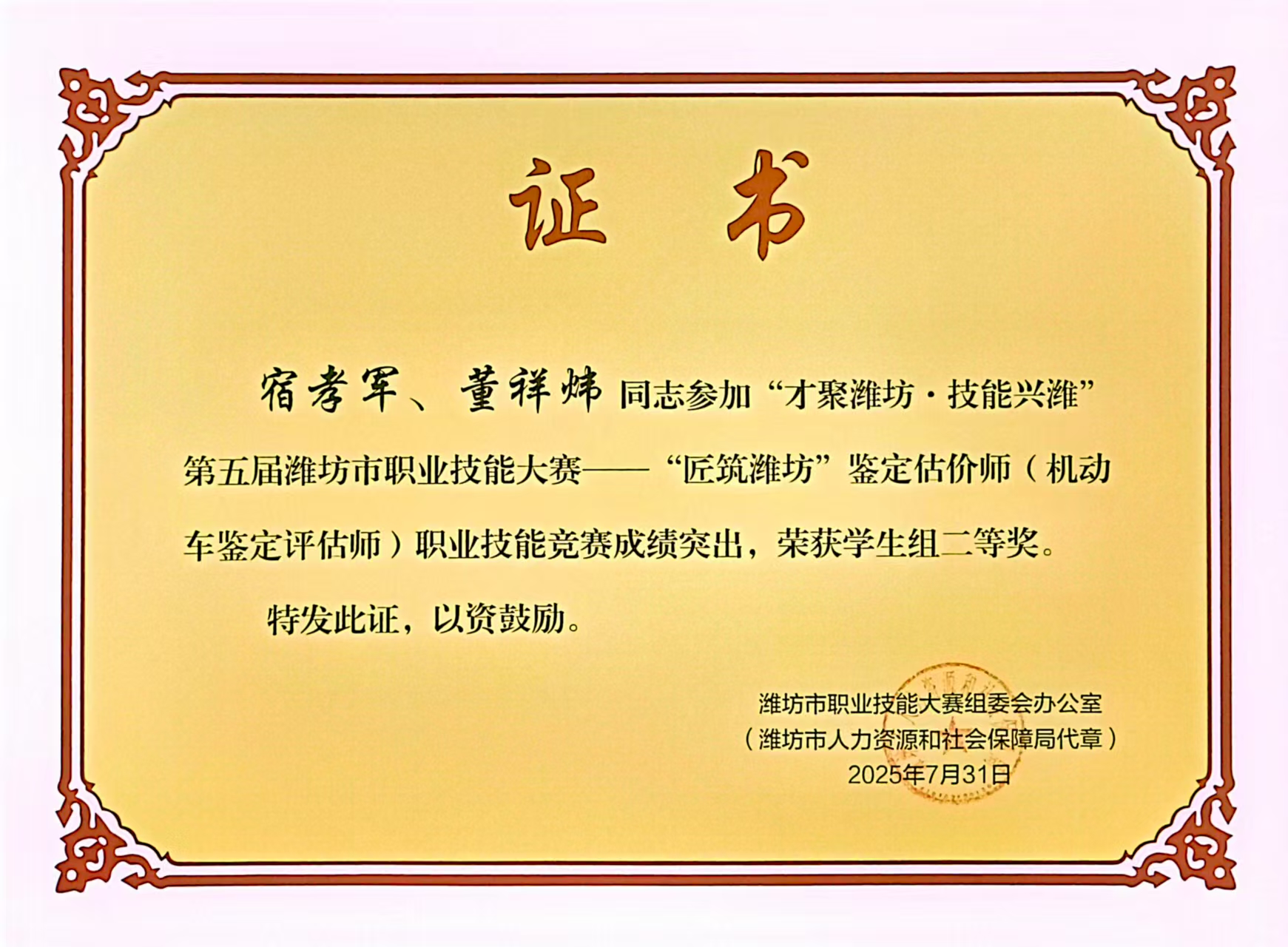 喜报频传,载誉而归! 在6月27日落幕的“才聚潍坊·技能兴潍”第五届潍坊市职业技能大赛——机动车鉴定评估师职业技能竞赛中,潍坊坊华科技中等职业学校师生凭借扎实的专业功底、精湛的技艺水平和出色的临场发挥,在激烈的角逐中脱颖而出,斩获学生组二等奖1项、三等奖2项,职工组二等奖1项、三等奖1项的优异成绩,再次生动体现了学校强化实践育人成效。