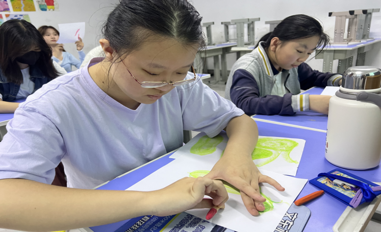 “看,我们的学生学习的多认真!”同学们全神贯注,大胆地将心中的构思付诸笔端。从最初的生涩尝试,到慢慢的色彩运用,一幅幅充满个性和创意的蜡笔画作在同学们手中诞生。每一幅作品都是独一无二的,承载着同学们对美的理解和表达。
